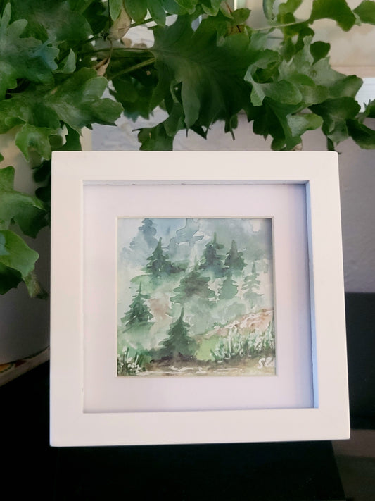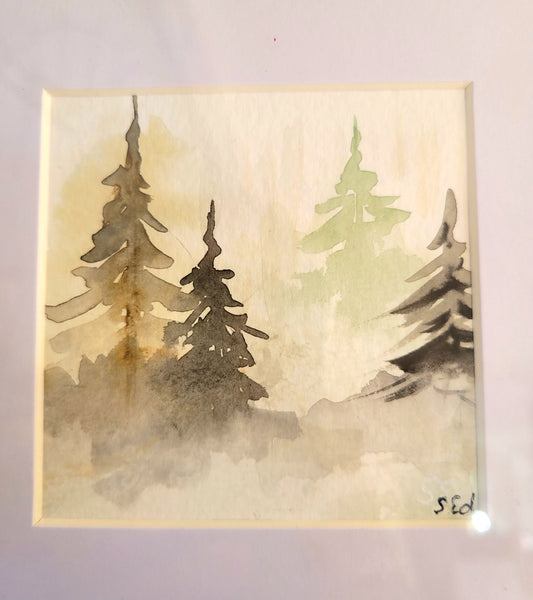 Watercolor ´Fir trees in the fog´, 8x8cm