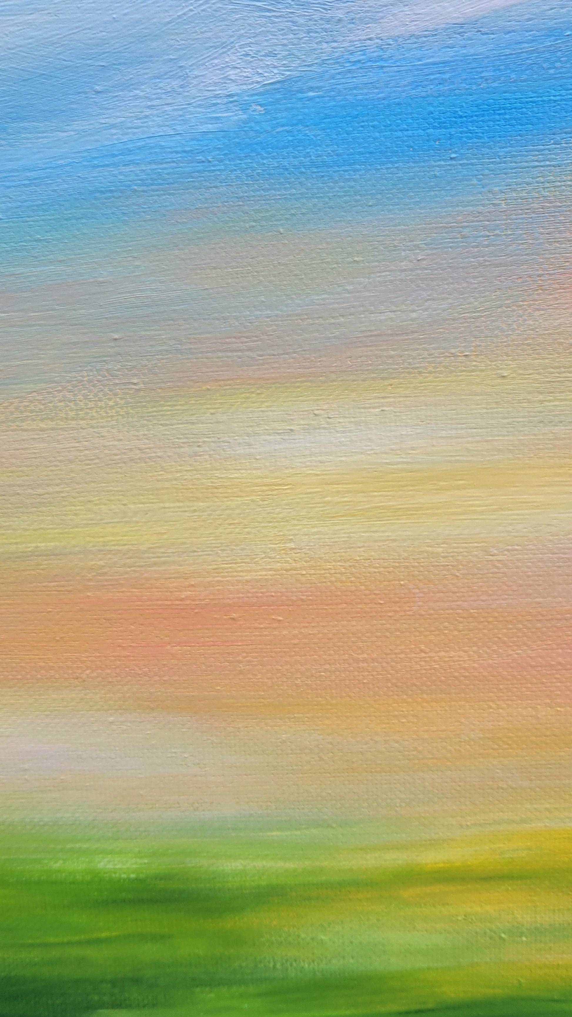 A captivating artwork that calms the soul: this semi-abstract landscape invites you into a world of warm greens, earthy ochres, and soft yellows. Delicate skin-toned nuances and flowing cloud formations create a poetic atmosphere, while the eye travels effortlessly across the open land. Blending abstraction with a sense of depth, the painting radiates meditative tranquility, making it ideal for anyone who wants to create a space of stillness and contemplation at home. A refined piece that fills your rooms with warmth and artistic elegance.