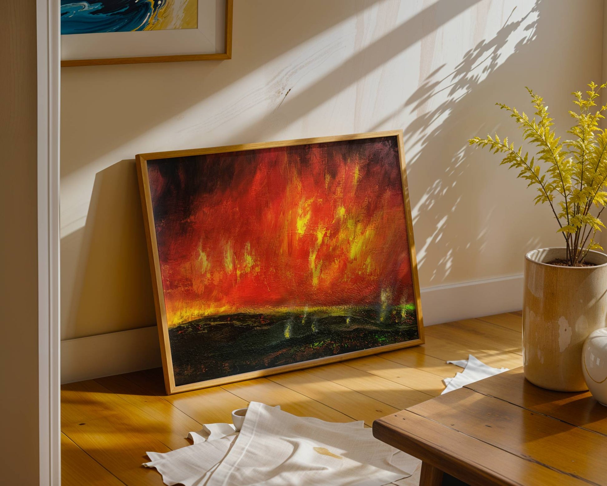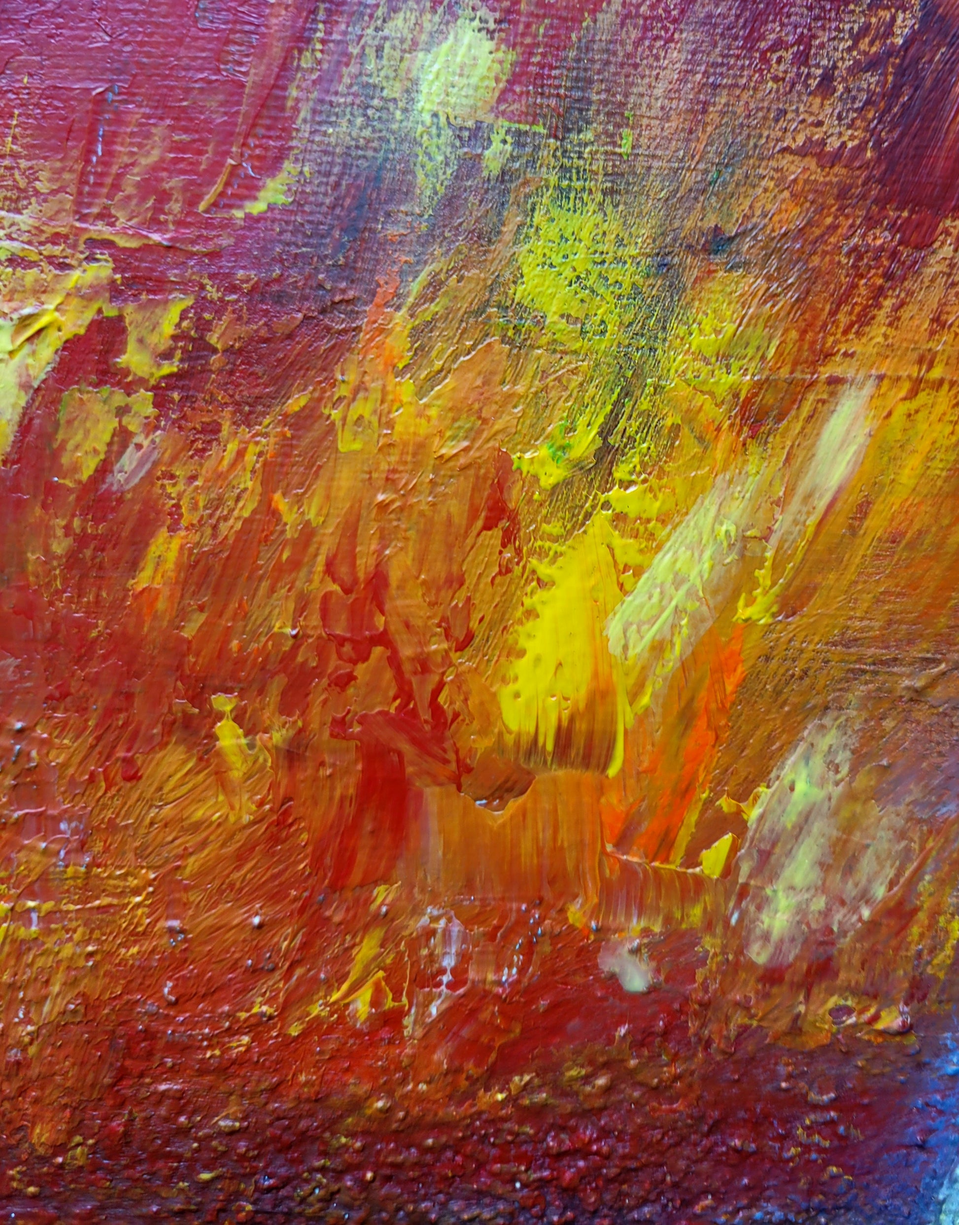 In the middle ground and background, the true inferno opens up: a blazing sea of red, orange, and yellow, reminiscent of lava or a massive wildfire. The Eifel remains only as a suggestion through rolling hill shapes and crater-like contours, a subtle reminder of the region’s volcanic origins. The painting merges gritty texture, glowing embers, and a sweeping wall of flame into an intense, unsettlingly beautiful scene filled with heat, motion, and tension.