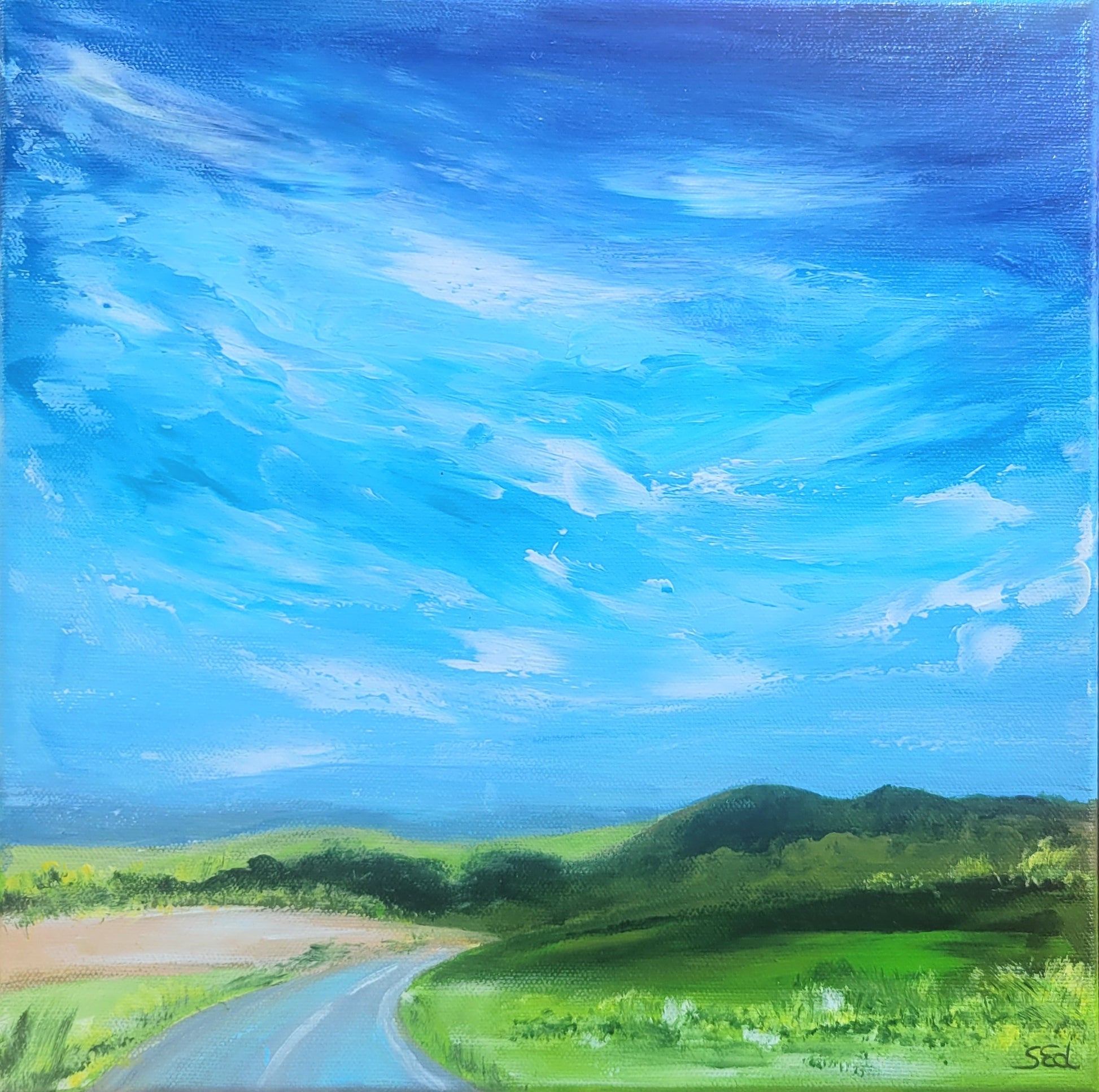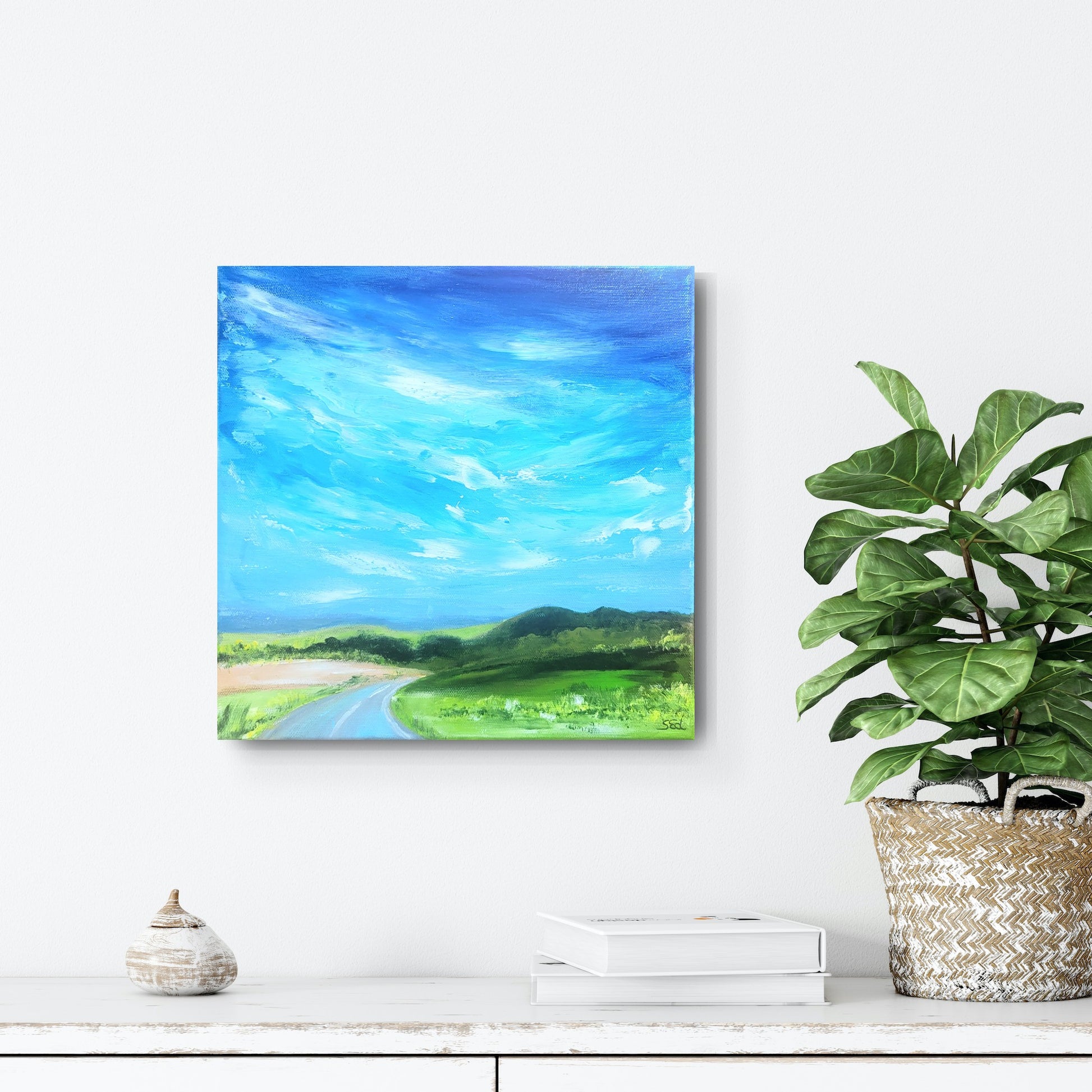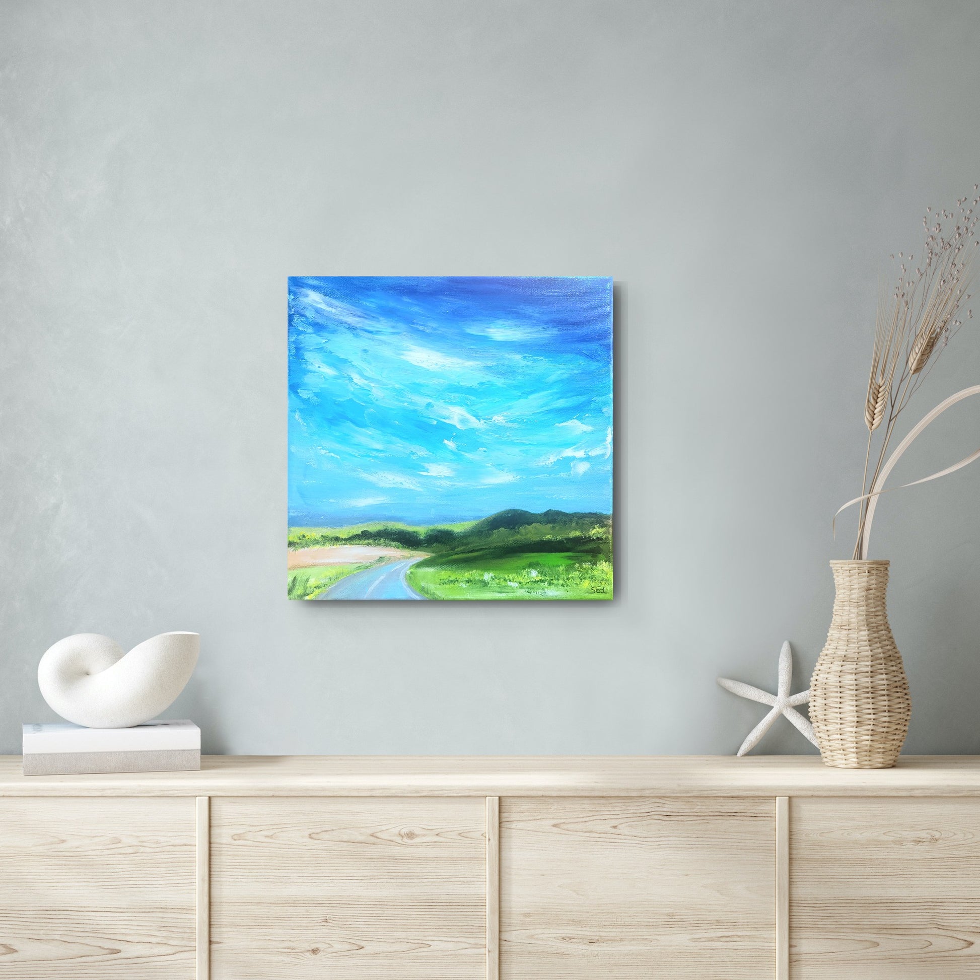 With this acrylic painting, I wanted to capture the gentle energy of an unspoiled meadow landscape. The impressionist style brings the scene to life—almost as if you could feel the wind and smell the blossoms. It brings a fresh, calming atmosphere to any room and reminds how beautiful it is to drive through the Eifel, seeing the powerful nature all around. A small, expressive artwork, shipped in a simple shadow-box frame.